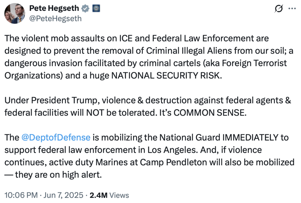 “The violent mob assaults on ICE and Federal Law Enforcement are designed to prevent the removal of Criminal Illegal Aliens from our soil,” Hegseth wrote in an X post on Saturday night. “A dangerous invasion facilitated by criminal cartels (aka Foreign Terrorist Organizations) and a huge NATIONAL SECURITY RISK.”