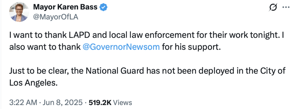 “I want to thank LAPD and local law enforcement for their work tonight. I also want to thank [Gavin Newsom] for his support,” the mayor wrote. “Just to be clear, the National Guard has not been deployed in the City of Los Angeles.”